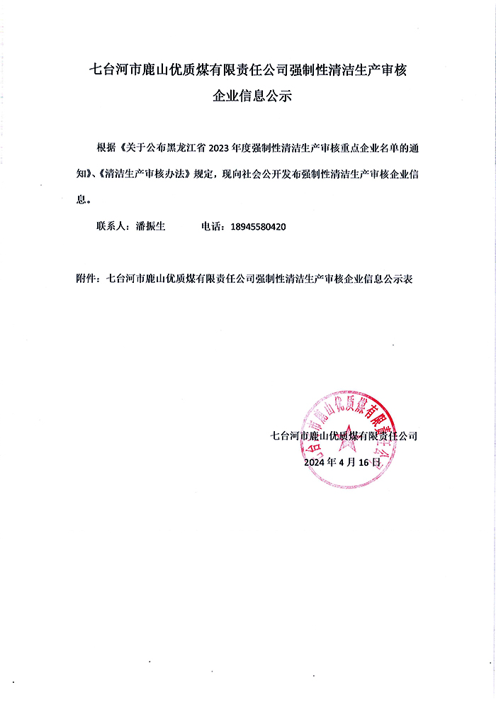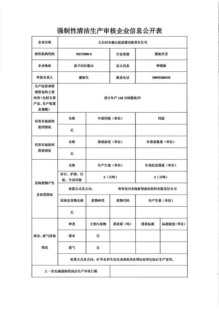 七臺河市鹿山優(yōu)質煤有限責任公司強制性清潔生產審核企業(yè)信息公示